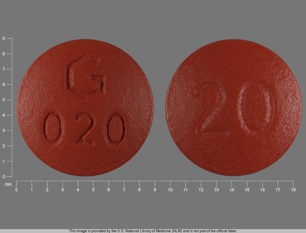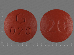 An imprint code is a combination of letters, numbers, or symbols that appears on a pill, tablet, or capsule. The FDA requires all approved drug products to have a unique imprint so that they can be identified in case of accidental ingestion or medication confusion. The imprint 20;20 is the code found on the pill you are looking up.