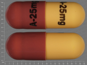 An imprint code is a combination of letters, numbers, or symbols that appears on a pill, tablet, or capsule. The FDA requires all approved drug products to have a unique imprint so that they can be identified in case of accidental ingestion or medication confusion. The imprint 25 is the code found on the pill you are looking up.