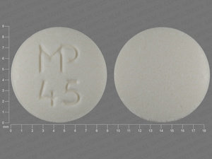 This medication is a White Round 9 mm, Unknown with imprint "MP;45". It is manufactured by Mutual Pharmaceutical Company, Inc.. For details please contact your physician.