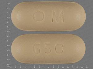 This medication is a Yellow Oval 16 mm, Unknown with imprint "O;M;650". It is manufactured by Ortho-McNeil-Janssen Pharmaceuticals, Inc.. For details please contact your physician.