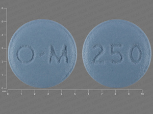 This medication is a Blue Round 5 mm, Tablet with imprint "O;M;250". It is manufactured by Janssen Pharmaceuticals, Inc.. For details please contact your physician.
