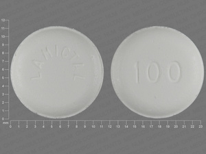 This medication is a White Round 11 mm, Tablet with imprint "LAMICTAL;100". It contains 100 mg/25 mg/50 mg of Lamotrigine 100 mg. It is manufactured by GlaxoSmithKline LLC. For details please contact your physician.
