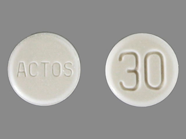 This medication is a White Round 7 mm, Tablet with imprint "ACTOS;30". It contains Pioglitazone hydrochloride 30 mg; of Pioglitazone hydrochloride[pioglitazone];. This belongs to the Peroxisome proliferator receptor alpha agonist pharmacologic class. It is manufactured by Takeda Pharmaceuticals America, Inc.. For details please contact your physician.