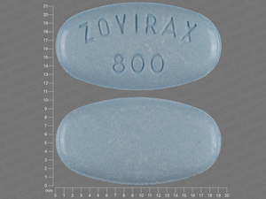 This medication is a Blue Oval 19 mm, Tablet with imprint "ZOVIRAX;800". It contains 800 mg of Acyclovir 800 mg. It is manufactured by GlaxoSmithKline LLC. For details please contact your physician.