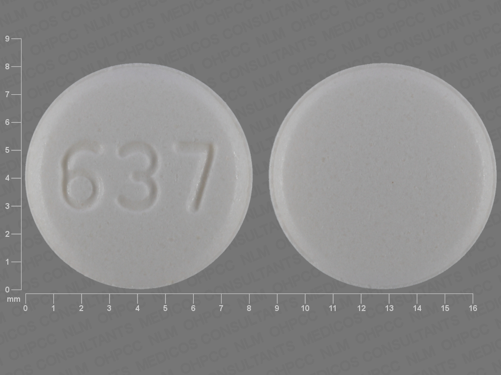 This medication is a White Round 8 mm, Tablet with imprint "637". It is manufactured by Sun Pharma Global FZE. For details please contact your physician.