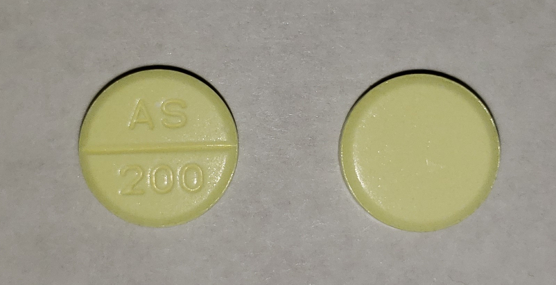 This medication is a Yellow Round 10 mm, Tablet with imprint "AS;200". It contains Amiodarone hydrochloride 200 mg; of Amiodarone hydrochloride[amiodarone];. This belongs to the Antiarrhythmic pharmacologic class. It is manufactured by Cameron Pharmaceuticals, LLC. For details please contact your physician.