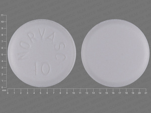 This medication is a White Round 10 mm, Tablet with imprint "NORVASC;10". It contains 10 mg of Amlodipine besylate 10 mg. It is manufactured by Pfizer Laboratories, Division of Pfizer Inc. For details please contact your physician.