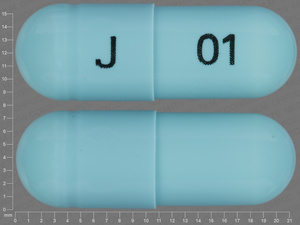 This medication is a Blue Capsule 22 mm, Capsule with imprint "J;01". It is manufactured by Aurobindo Pharma Limited. For details please contact your physician.