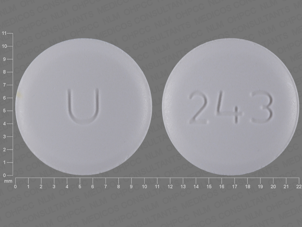 This medication is a White Round 11 mm, Tablet with imprint "U;243". It contains Amlodipine besylate 10 mg; of Amlodipine besylate[amlodipine];. This belongs to the Dihydropyridine calcium channel blocker pharmacologic class. It is manufactured by Unichem Pharmaceuticals (USA), Inc.. For details please contact your physician.