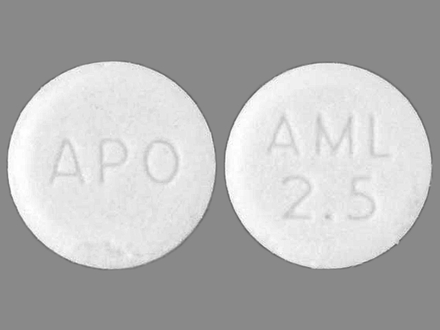 This medication is a White Round 5 mm, Tablet with imprint "APO;AML;2;5". It contains Amlodipine besylate 2.5 mg; of Amlodipine besylate[amlodipine];. This belongs to the Dihydropyridine calcium channel blocker pharmacologic class. It is manufactured by Apotex Corp.. For details please contact your physician.