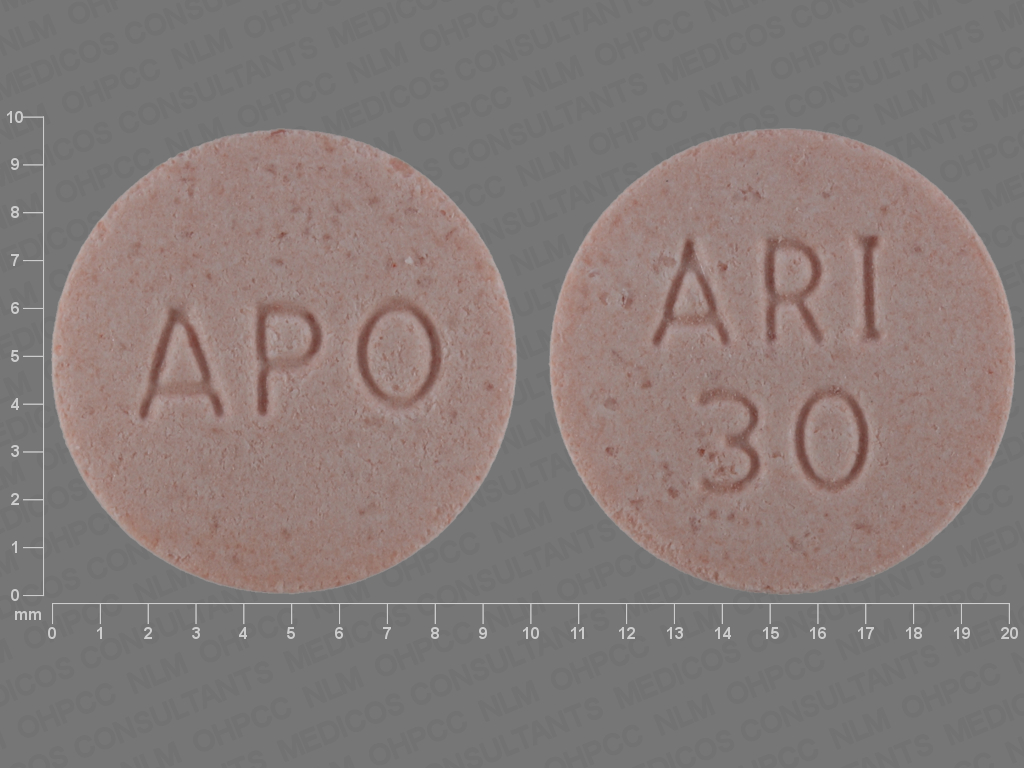 This medication is a Pink Round 10 mm, Tablet with imprint "ARI;30;APO". It is manufactured by Apotex Corp.. For details please contact your physician.