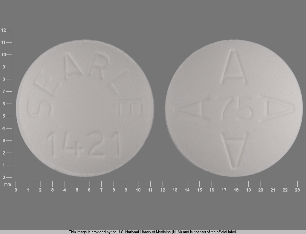 This medication is a White Round 11 mm, Film coated tablet with imprint "SEARLE;1421;AAAA;75". It contains Diclofenac sodium 75 mg;misoprostol 200 ug; of Diclofenac sodium[diclofenac];misoprostol[misoprostol];. This belongs to the Nonsteroidal anti-inflammatory drug pharmacologic class. It is manufactured by G.D. Searle LLC Division of Pfizer Inc. For details please contact your physician.