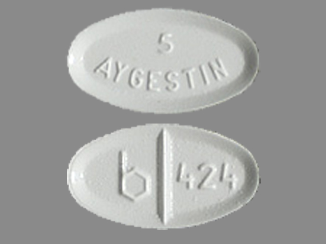 This medication is a White Oval 11 mm, Tablet with imprint "5;AYGESTIN;b;424". It contains Norethindrone acetate 5 mg; of Norethindrone acetate[norethindrone];. This belongs to the Progestin pharmacologic class. It is manufactured by Teva Women's Health, Inc.. For details please contact your physician.