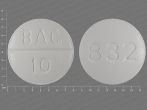 This medication is a White Round 8 mm, Tablet with imprint "BAC;10;832". It contains 10 mg of Baclofen 10 mg. It is manufactured by Upsher-Smith Laboratories, Inc.. For details please contact your physician.