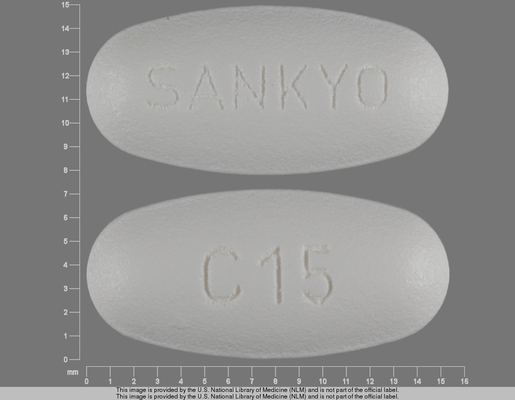 This medication is a White Oval 15 mm, Film coated tablet with imprint "Sankyo;C15". This belongs to the Angiotensin 2 receptor blocker pharmacologic class. It is manufactured by Daiichi Sankyo. For details please contact your physician.