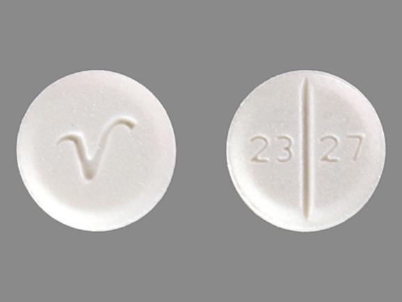 This medication is a White Round 7 mm, Tablet with imprint "2327;V". It contains Benztropine mesylate 2 mg; of Benztropine mesylate[benztropine];. This belongs to the Anticholinergic pharmacologic class. It is manufactured by Qualitest Pharmaceuticals. For details please contact your physician.