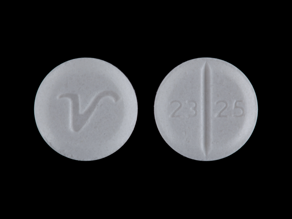 This medication is a White Round 6 mm, Tablet with imprint "2325;V". It contains Benztropine mesylate 0.5 mg; of Benztropine mesylate[benztropine];. This belongs to the Anticholinergic pharmacologic class. It is manufactured by Qualitest Pharmaceuticals. For details please contact your physician.