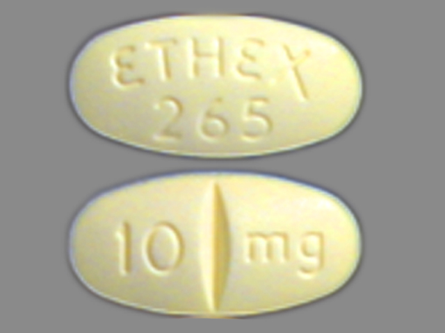 This medication is a Yellow Oval 11 mm, Tablet with imprint "ETHEX;265;10;mg". It is manufactured by ETHEX. For details please contact your physician.
