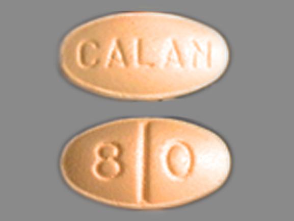 This medication is an Orange Oval 11 mm, Film coated tablet with imprint "CALAN;80". It contains Verapamil hydrochloride 80 mg; of Verapamil hydrochloride[verapamil];. This belongs to the Calcium channel blocker pharmacologic class. It is manufactured by G.D. Searle LLC Division of Pfizer Inc. For details please contact your physician.