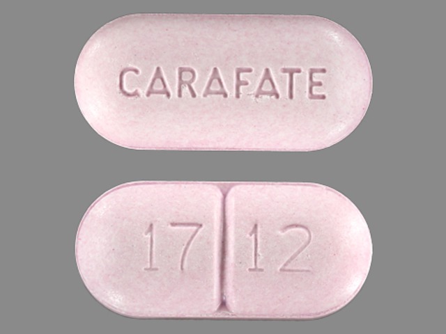 This medication is a Pink Oval 10 mm, Tablet with imprint "CARAFATE;1712". It contains Sucralfate 1 g;magnesium stearate 12 mg;cellulose, microcrystalline 115 mg;d&c red no. 30 1.25 mg;fd&c blue no. 1 0.16 mg;starch, corn 76.59 mg; of Sucralfate[sucralfate];magnesium stearate[];cellulose, microcrystalline[];d&c red no. 30[];fd&c blue no. 1[];starch, corn[];. This belongs to the Aluminum complex pharmacologic class. It is manufactured by Allergan, Inc.. For details please contact your physician.
