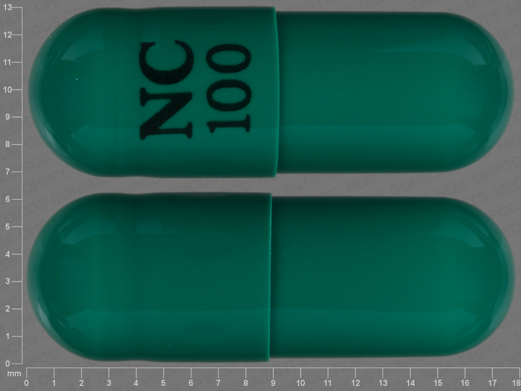 This medication is a Green Capsule 18 mm, Extended release capsule with imprint "NC;100". It is manufactured by Nostrum Laboratories, Inc.. For details please contact your physician.