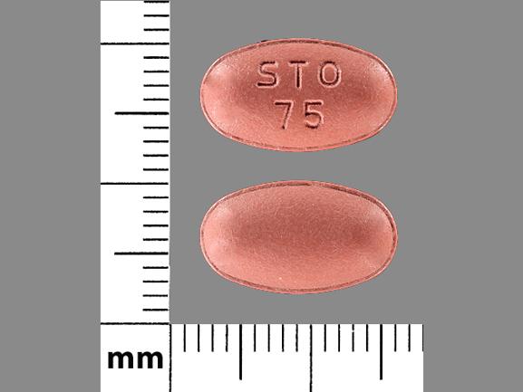 This medication is a Brown Oval 14 mm, Film coated tablet with imprint "STO;75". It contains Carbidopa 18.75 mg;levodopa 75 mg;entacapone 200 mg; of Carbidopa[carbidopa anhydrous];levodopa[levodopa];entacapone[entacapone];. It is manufactured by Mylan Pharmaceuticals Inc.. For details please contact your physician.