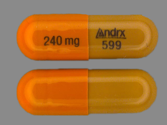 This medication is a Brown;orange Capsule 22 mm, Extended release capsule with imprint "Andrx;599;240;mg". It contains Diltiazem hydrochloride 240 mg; of Diltiazem hydrochloride[diltiazem];. This belongs to the Calcium channel blocker pharmacologic class. It is manufactured by Actavis Pharma, Inc.. For details please contact your physician.