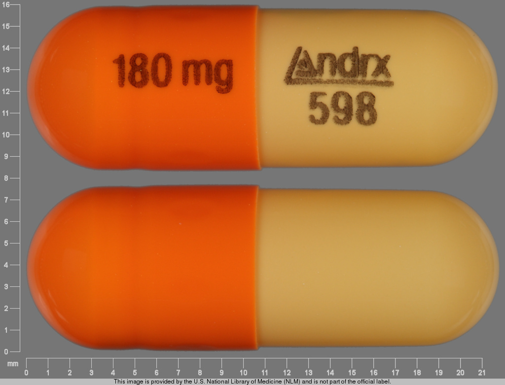 This medication is a Yellow;orange Capsule 22 mm, Extended release capsule with imprint "Andrx;598;180;mg". It contains Diltiazem hydrochloride 180 mg; of Diltiazem hydrochloride[diltiazem];. This belongs to the Calcium channel blocker pharmacologic class. It is manufactured by Actavis Pharma, Inc.. For details please contact your physician.