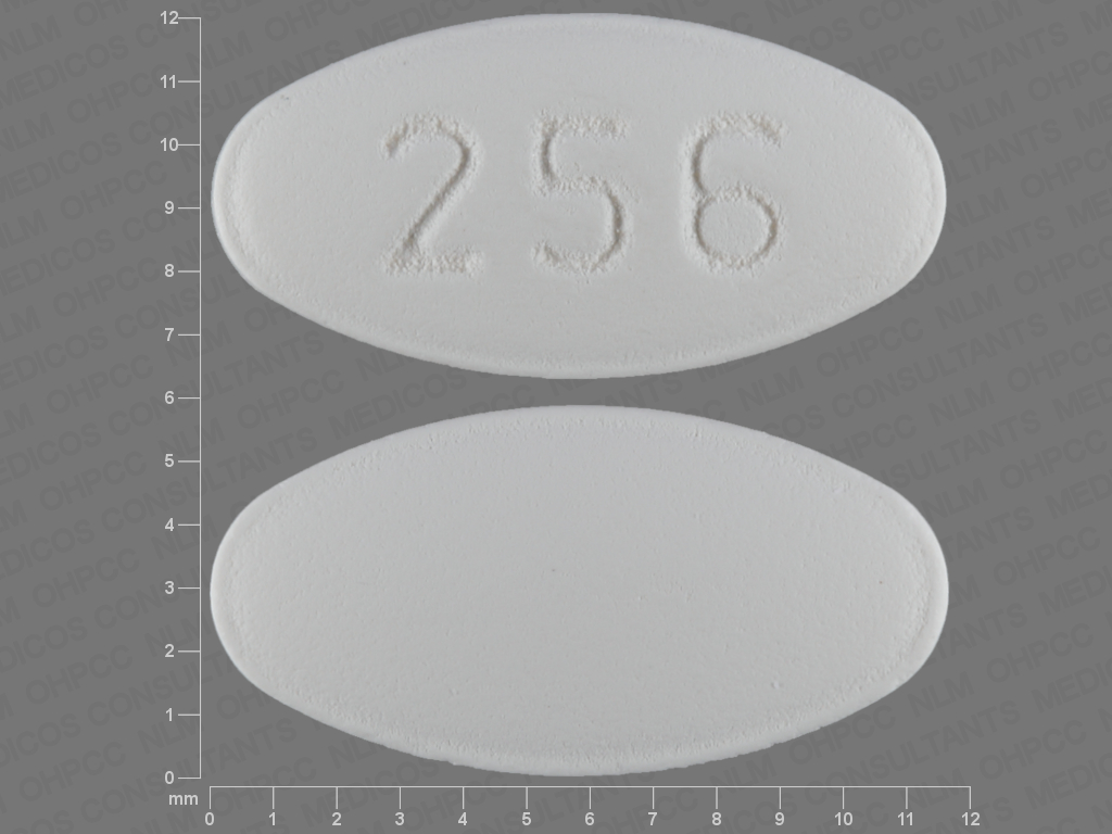 This medication is a White Oval 12 mm, Tablet with imprint "256". It is manufactured by Solco Healthecare US, LLC. For details please contact your physician.