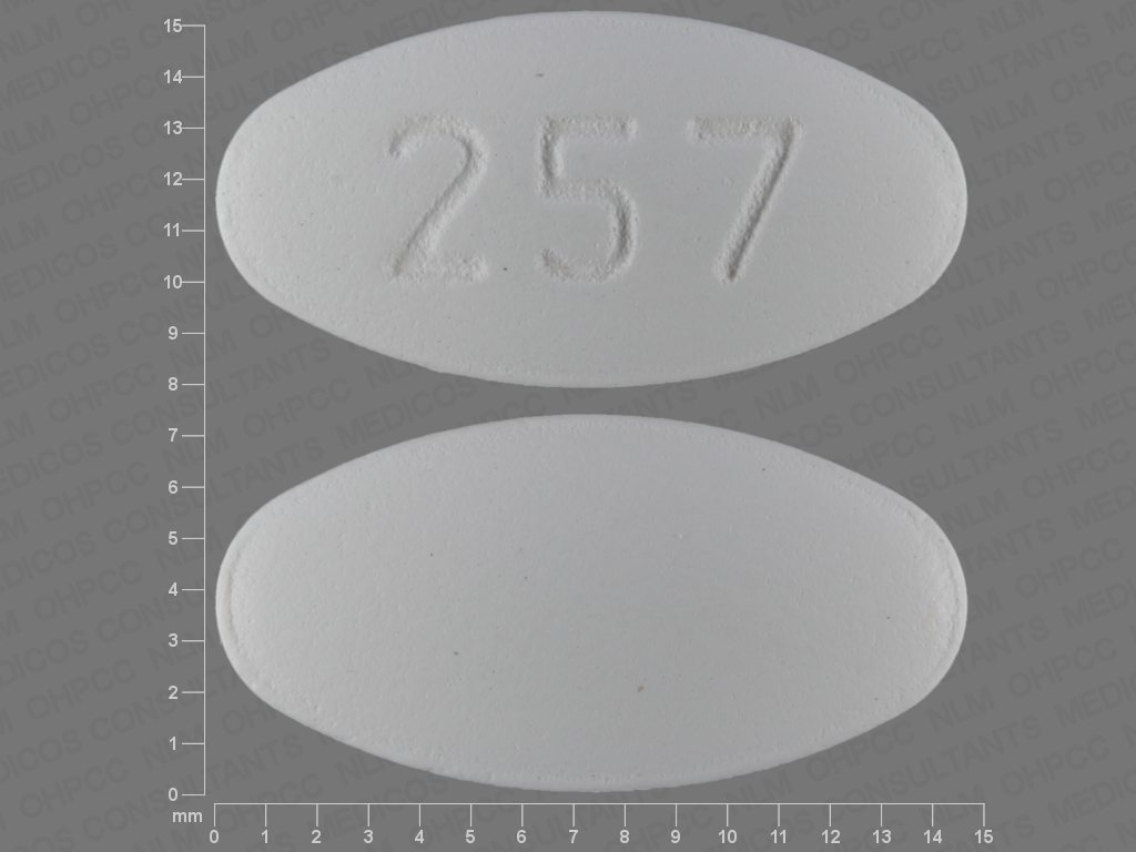 This medication is a White Oval 15 mm, Tablet with imprint "257". It is manufactured by Solco Healthecare US, LLC. For details please contact your physician.