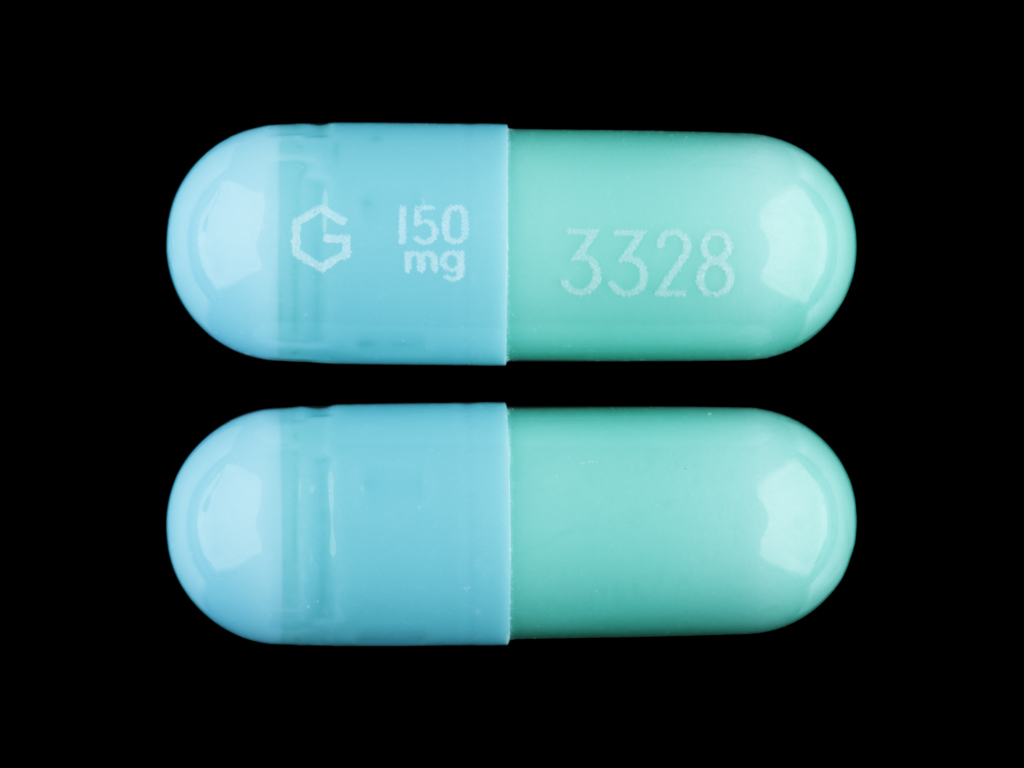 This medication is a Blue;green Capsule 19 mm, Capsule with imprint "G150;mg;3328". It contains Clindamycin hydrochloride 150 mg; of Clindamycin hydrochloride[clindamycin];. This belongs to the Lincosamide antibacterial pharmacologic class. It is manufactured by Greenstone LLC. For details please contact your physician.