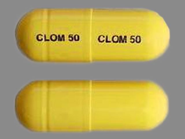 This medication is a Yellow Capsule 20 mm, Capsule with imprint "CLOM50". It contains Clomipramine hydrochloride 50 mg; of Clomipramine hydrochloride[clomipramine];. This belongs to the Tricyclic antidepressant pharmacologic class. It is manufactured by Taro Pharmaceuticals U.S.A., Inc.. For details please contact your physician.