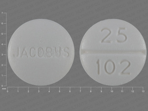 This medication is a White Round 6 mm, Tablet with imprint "25;102;JACOBUS". It is manufactured by Seton Pharmaceuticals. For details please contact your physician.
