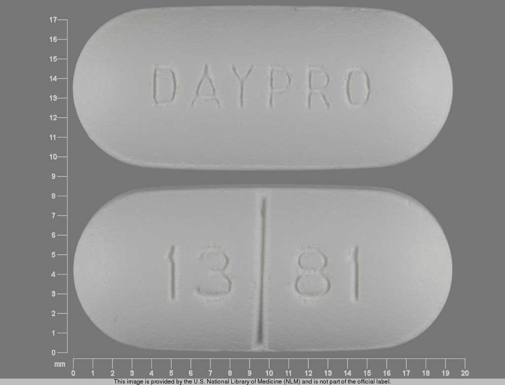 This medication is a White Oval 19 mm, Film coated tablet with imprint "DAYPRO;1381". It contains Oxaprozin 600 mg; of Oxaprozin[oxaprozin];. This belongs to the Nonsteroidal anti-inflammatory drug pharmacologic class. It is manufactured by G.D. Searle LLC Division of Pfizer Inc. For details please contact your physician.