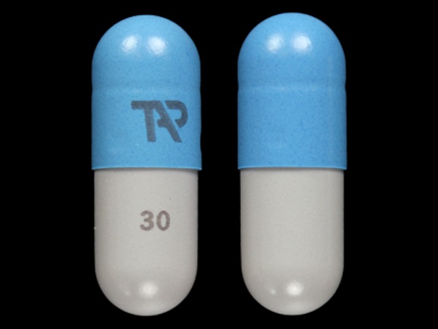 This medication is a Blue;gray Capsule 16 mm, Delayed release capsule with imprint "TAP;30". It contains Dexlansoprazole 30 mg; of Dexlansoprazole[dexlansoprazole];. This belongs to the Proton pump inhibitor pharmacologic class. It is manufactured by Takeda Pharmaceuticals America, Inc.. For details please contact your physician.