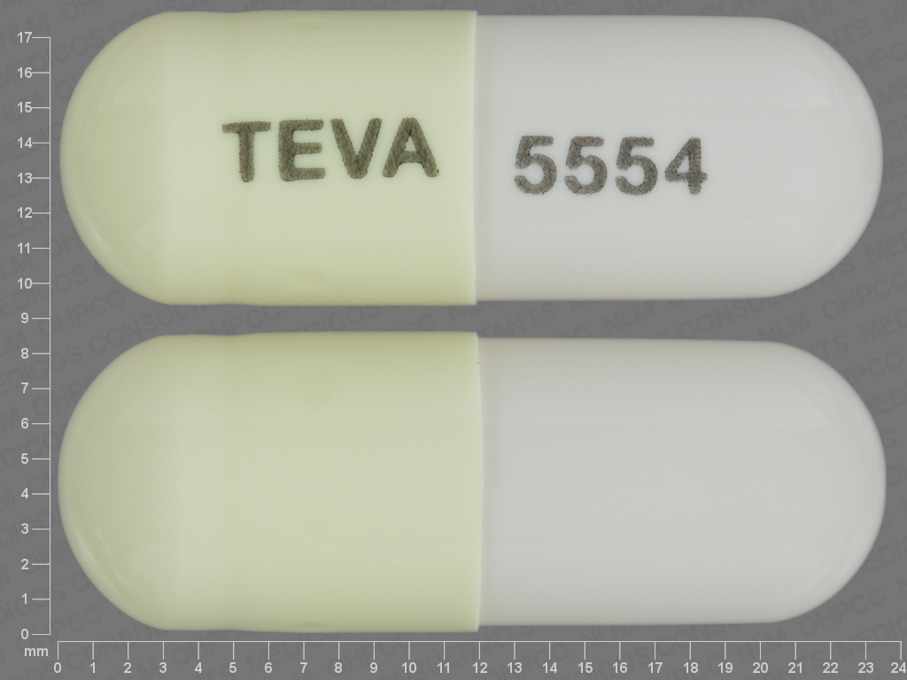 This medication is a White, yellow Capsule 23 mm, Extended release capsule with imprint "TEVA;5554". It is manufactured by Teva Pharmaceuticals USA Inc. For details please contact your physician.