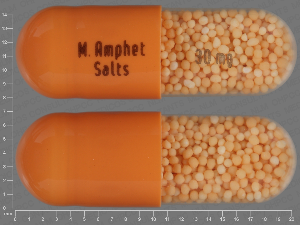 This medication is a Brown;orange Capsule 21 mm, Extended release capsule with imprint "M;Amphet;Salts;30;mg". It contains Dextroamphetamine saccharate 7.5 mg;amphetamine aspartate monohydrate 7.5 mg;dextroamphetamine sulfate 7.5 mg;amphetamine sulfate 7.5 mg; of Dextroamphetamine saccharate[dextroamphetamine];amphetamine aspartate monohydrate[amphetamine];dextroamphetamine sulfate[dextroamphetamine];amphetamine sulfate[amphetamine];. It is manufactured by Barr Laboratories Inc.. For details please contact your physician.