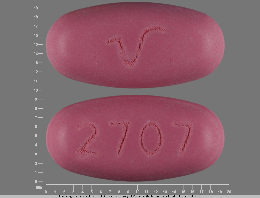 This medication is a Pink Oval 19 mm, Film coated tablet with imprint "2707;V". It contains Divalproex sodium 500 mg; of Divalproex sodium[valproic acid];. It is manufactured by Qualitest Pharmaceuticals. For details please contact your physician.