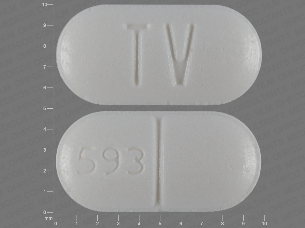 This medication is a White Oval 10 mm, Tablet with imprint "593;TV". It is manufactured by Teva Pharmaceuticals USA Inc. For details please contact your physician.