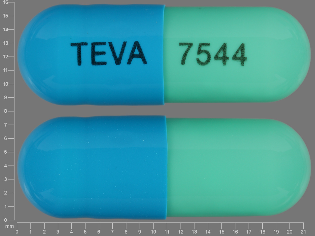 This medication is a Blue;green Capsule 22 mm, Delayed release pellet in capsule with imprint "TEVA;7544". It contains Duloxetine hydrochloride 60 mg; of Duloxetine hydrochloride[duloxetine];. This belongs to the Serotonin and norepinephrine reuptake inhibitor pharmacologic class. It is manufactured by QPharma Inc. For details please contact your physician.