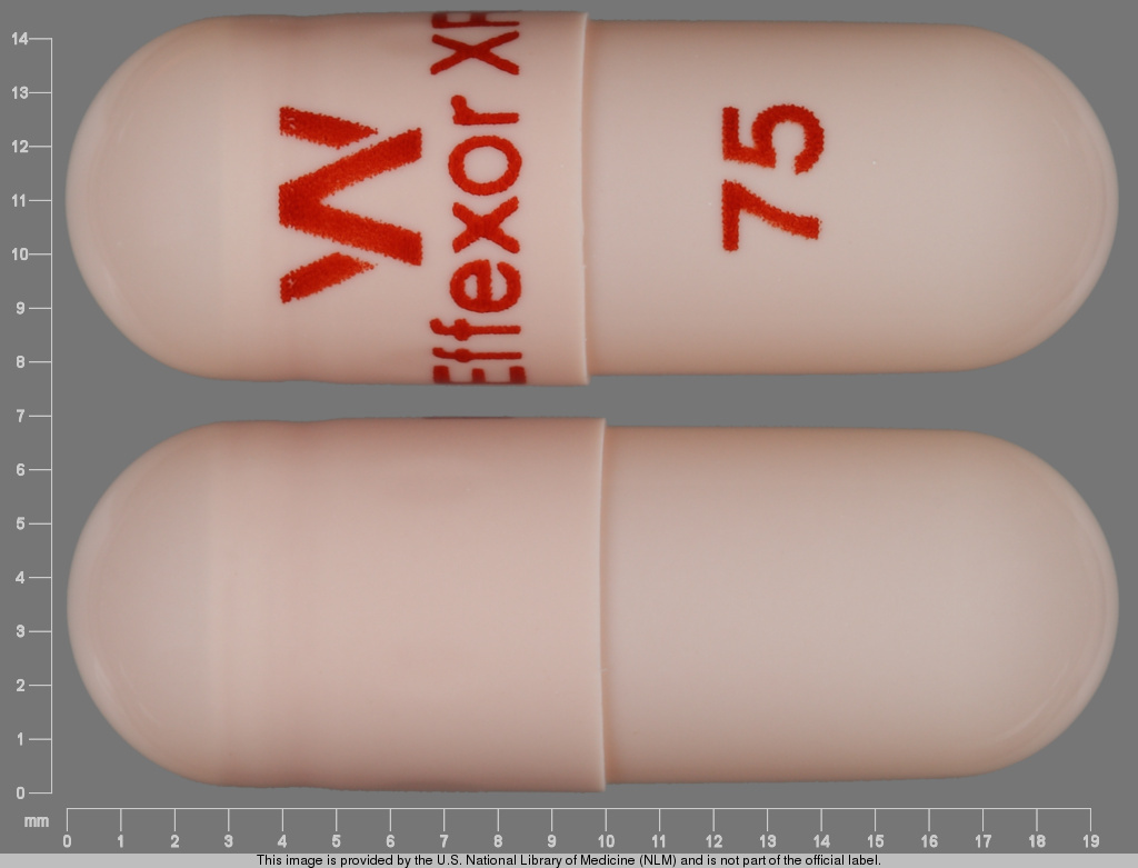 This medication is an Orange Capsule 20 mm, Extended release capsule with imprint "W;EffexorXR;75". It contains Venlafaxine hydrochloride 75 mg; of Venlafaxine hydrochloride[venlafaxine];. This belongs to the Serotonin and norepinephrine reuptake inhibitor pharmacologic class. It is manufactured by Wyeth Pharmaceuticals LLC, a subsidiary of Pfizer Inc.. For details please contact your physician.