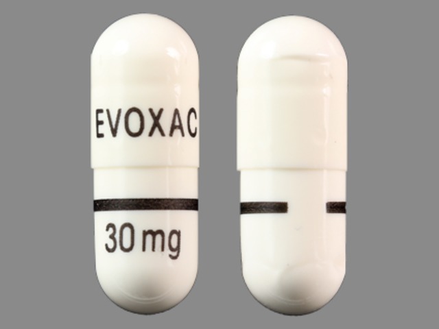 This medication is a White Capsule 15 mm, Capsule with imprint "EVOXAC;30;mg". It contains Cevimeline hydrochloride 30 mg; of Cevimeline hydrochloride[cevimeline];. This belongs to the Cholinergic receptor agonist pharmacologic class. It is manufactured by Daiichi Sankyo, Inc.. For details please contact your physician.