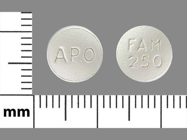 This medication is a White Round 9 mm, Film coated tablet with imprint "APO;FAM;250". It contains Famciclovir 250 mg; of Famciclovir[penciclovir];. This belongs to the Herpes simplex virus nucleoside analog dna polymerase inhibitor pharmacologic class. It is manufactured by Apotex Corp.. For details please contact your physician.