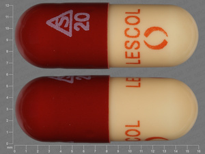 This medication is a Brown, white Capsule 16 mm, Capsule with imprint "20;LESCOL". It contains 20 mg of Fluvastatin sodium 20 mg. It is manufactured by Novartis Pharmaceuticals Corporation. For details please contact your physician.