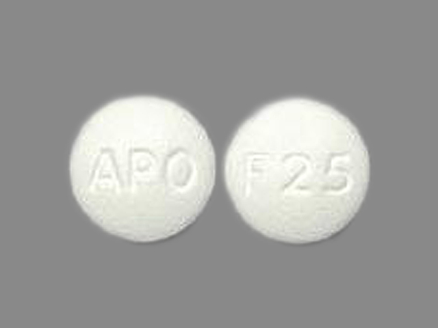 This medication is a White Round 6 mm, Tablet with imprint "APO;F25". It contains Fluvoxamine maleate 25 mg; of Fluvoxamine maleate[fluvoxamine];. This belongs to the Serotonin reuptake inhibitor pharmacologic class. It is manufactured by Golden State Medical Supply, Inc.. For details please contact your physician.