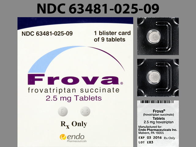 This medication is a White Round 8 mm, Film coated tablet with imprint "E;2;5". It contains Frovatriptan succinate 2.5 mg; of Frovatriptan succinate[frovatriptan];. This belongs to the Serotonin-1b and serotonin-1d receptor agonist pharmacologic class. It is manufactured by Endo Pharmaceuticals, Inc.. For details please contact your physician.
