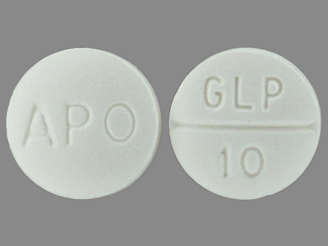 This medication is a White Round 8 mm, Tablet with imprint "APO;GLP;10". It contains Glipizide 10 mg; of Glipizide[glipizide];. This belongs to the Sulfonylurea pharmacologic class. It is manufactured by Apotex Corp.. For details please contact your physician.