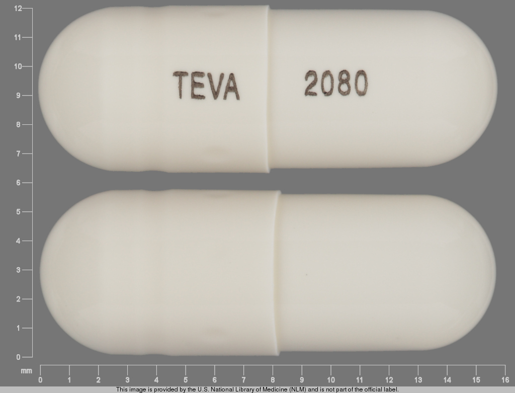This medication is a White Capsule 16 mm, Capsule with imprint "TEVA;2080". It contains Hydrochlorothiazide 12.5 mg of Hydrochlorothiazide[hydrochlorothiazide]. This belongs to the Thiazide diuretic pharmacologic class. It is manufactured by Teva Pharmaceuticals USA Inc. For details please contact your physician.