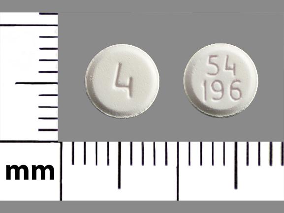 This medication is a White Round 6 mm, Tablet with imprint "4;54;196;". It contains Hydromorphone hydrochloride 4 mg; of Hydromorphone hydrochloride[hydromorphone];. This belongs to the Opioid agonist pharmacologic class. It is manufactured by West-Ward Pharmaceuticals Corp.. For details please contact your physician.