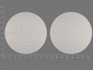 This medication is a White Round 8 mm, Tablet with imprint "WW;33". It contains 20 mg of Isosorbide mononitrate 20 mg. It is manufactured by West-ward Pharmaceutical Corp. For details please contact your physician.